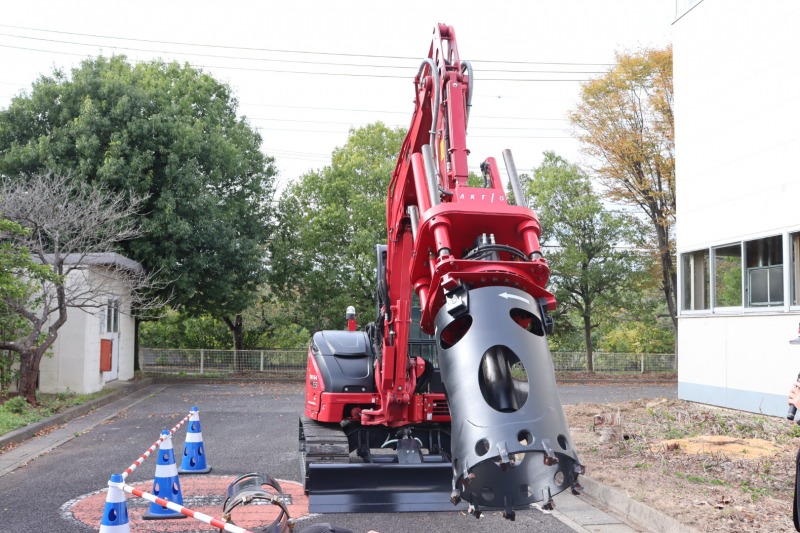 「根こそぎ切るソー」は、バックホーに円筒形のホールソーを装着し、切り株にかぶせてゆっくりと回転させることで地中の根を安全かつ効率的に切断する機械である。